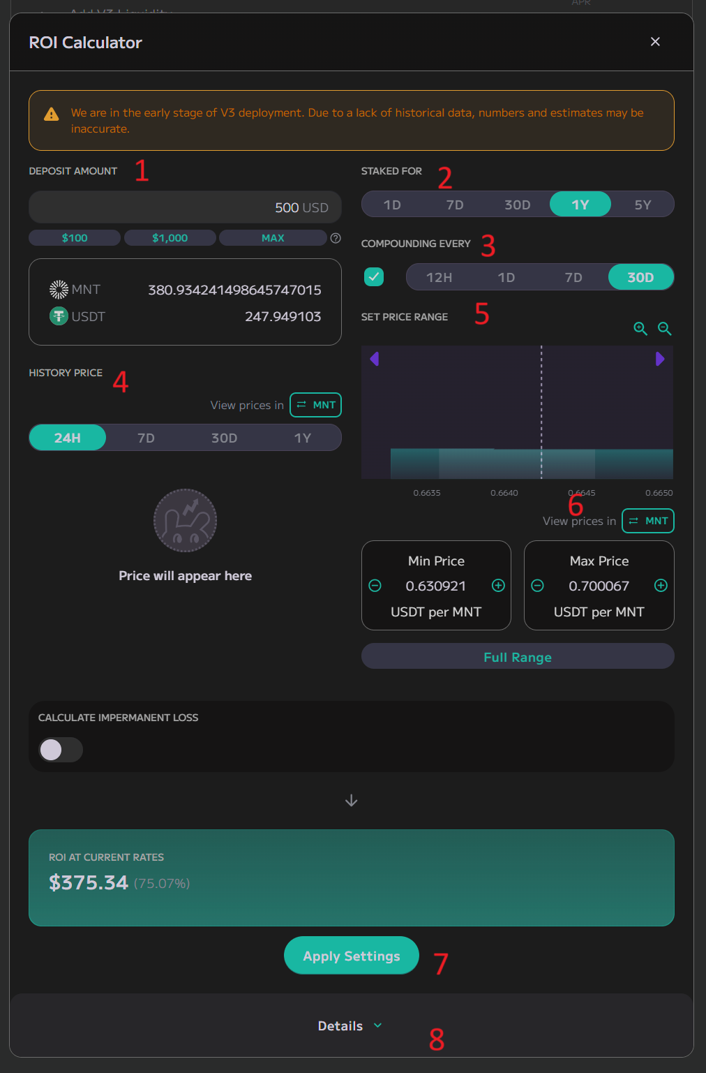 When you finish configuring in the ROI calculator, you can click “Apply Settings” to quickly apply the settings from the calculator back to the “Add Liquidity” window so you don’t need to match them manually.
