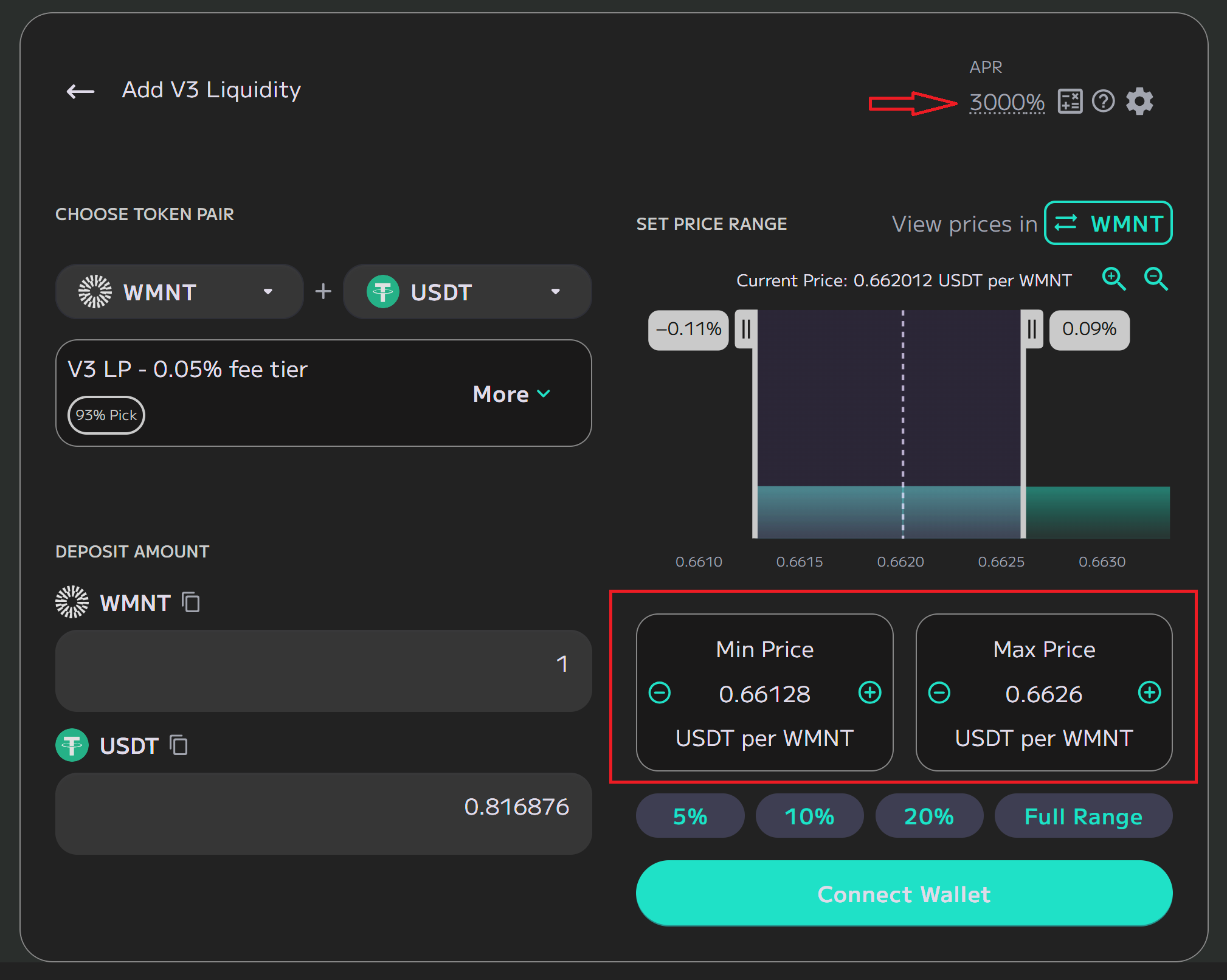 If you want to provide liquidity to the entire price range, click “Full Range”